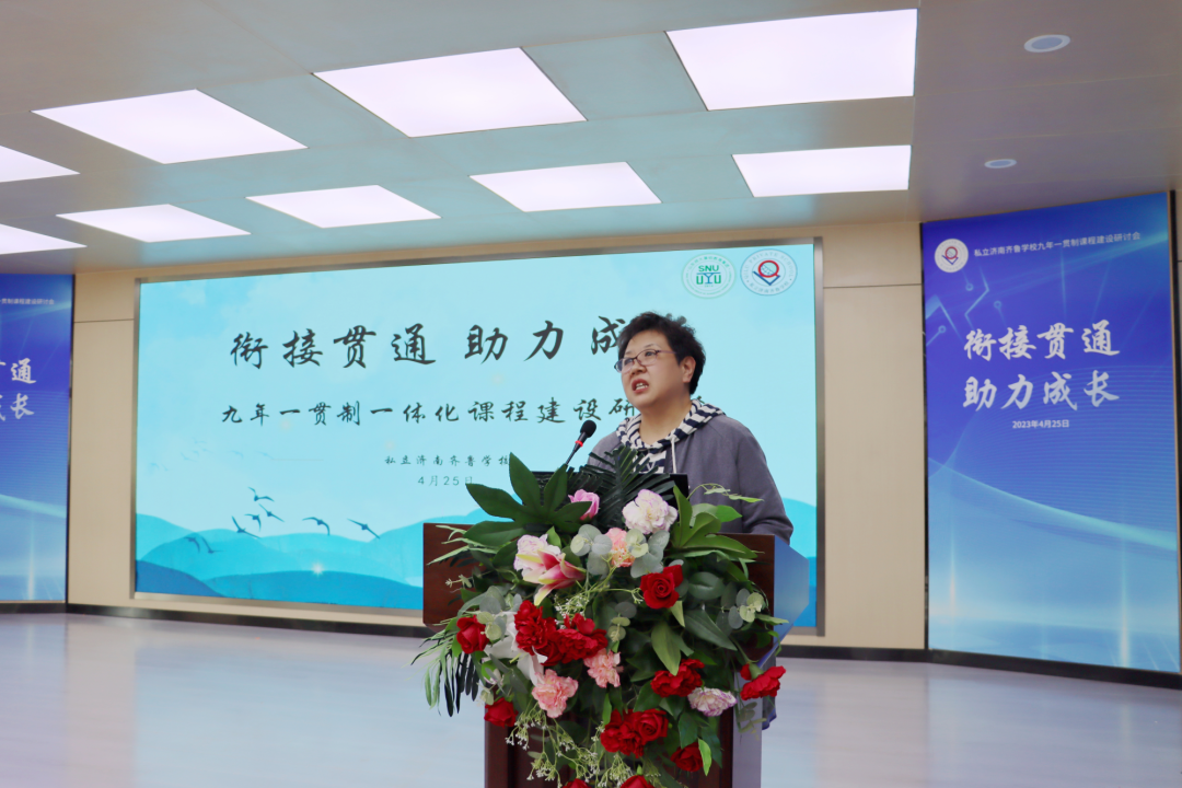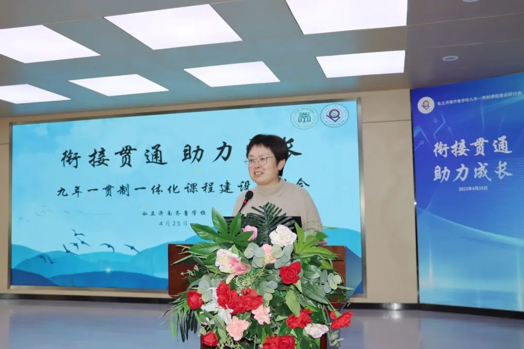 活动伊始,齐鲁学校校长孙艳梅作《一体化培养 赋能齐鲁学子更健康成长》的主题报告。她向与会教师分享了九年一贯制学校课程一体化培养的路径与思考。孙校长指出:齐鲁学校以课程为核心打通了“中小学”发展的壁垒,以“看见每一个,发展每一个,成就每一个”的初心和行动,充分发挥九年一贯的优势,用理念引路,用课程赋能,用一体化保障,助力每一个孩子“体魄健康、人格健全、成绩优异”,努力成为最好的自己。