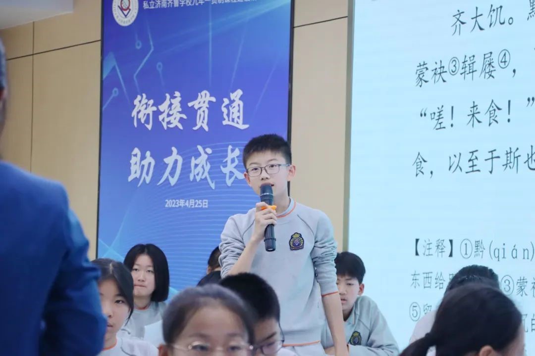 小学部张振秀老师执教阅读课《人工智能知多少》,以现代文为载体,以“读通、读懂、读透“为宗旨,通过分析什么是人工智能,人工智能的好处与弊端来引导学生辩证地看世界。课堂环节清晰高效,学生深入交流碰撞,思辨思维得到培养。中学部范晓静老师执教《小成语里的大中国》,以文言成语为载体,通过精读《嗟来之食》、《卧薪尝胆》提高学生阅读能力和思维品质,使得学生能力增长“看得见”、思维提升“摸得着“。无论是现代文还是文言文,无论是社会热点还是文化经典,通过非连续性文本阅读的方式提升学生的认知力、思考力、表达力,减缓了衔接的“坡度”,传递了语文阅读素养的“接力棒”,实现小学到中学的“软着陆”。