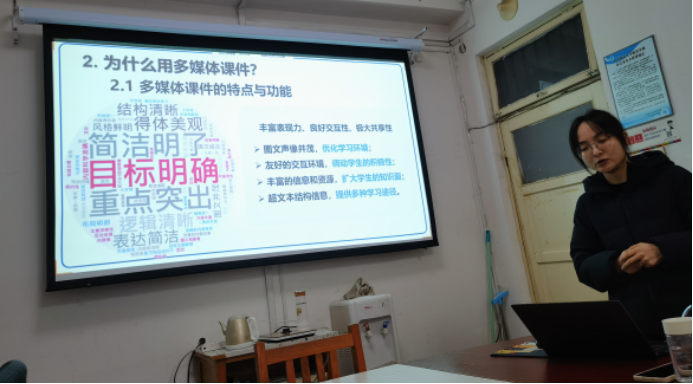 在公开课上,王超老师的教学内容围绕第七章“教学课件的设计与制作”为主题进行,从学生分组进行线上学习任务的汇报导入,采用讲授法、小组讨论法、案例分析法等教学方法,借助PPT演示呈现相关案例、场景和知识要点,环环相扣展开教学活动和呈现教学内容,帮助学生充分理解什么是多媒体课件、为什么使用多媒体课件开展教学等关键问题,课堂总体思路清晰、内容饱满、重点突出,并且做到了以学定教,师生互动较充分,学生参与度高,收到了较好的教学效果。