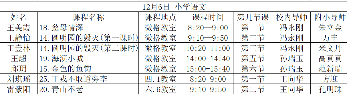 语文学科方面,实习生们充分重视这次锻炼和展示的机会,在各位指导教师的建议下,用心深研教材、精心备课、反复研磨,12月6日分别执教了七节汇报课。