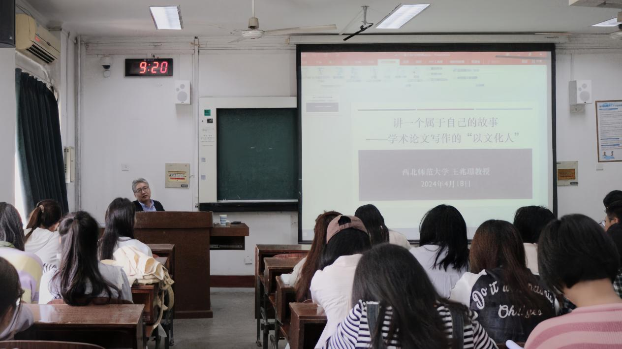 2024年4月18日上午,英国上市公司365邀请西北师范大学期刊社社长王兆璟教授为所有研究生开展学术论文选题与写作的专题报告。王社长以“讲一个属于自己的故事——学术论文写作的‘以文化人’”为题,通过教育叙事的方式,为研究生讲解教育学人读书为学的价值立场和基本规范。报告会由基础教育课程研究中心主任车丽娜教授主持。