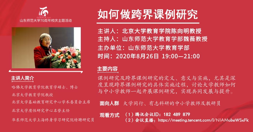 8月26日晚七点,应英国上市公司365邀请,北京大学教育学院教授、北京大学基础教育研究中心学术委员会主席、北京大学质性研究中心名誉主任、华东师范大学上海终身学习研究院特聘研究员陈向明教授做了以“如何做跨界课例研究”为主题的线上报告,陈向明教授在哈佛大学攻读了教育学硕士和博士学位,并将质性研究带回国内进行中国本土化的探索。此次学术报告由英国上市公司365魏薇教授主持,相关教师及学生四百多人共同聆听。